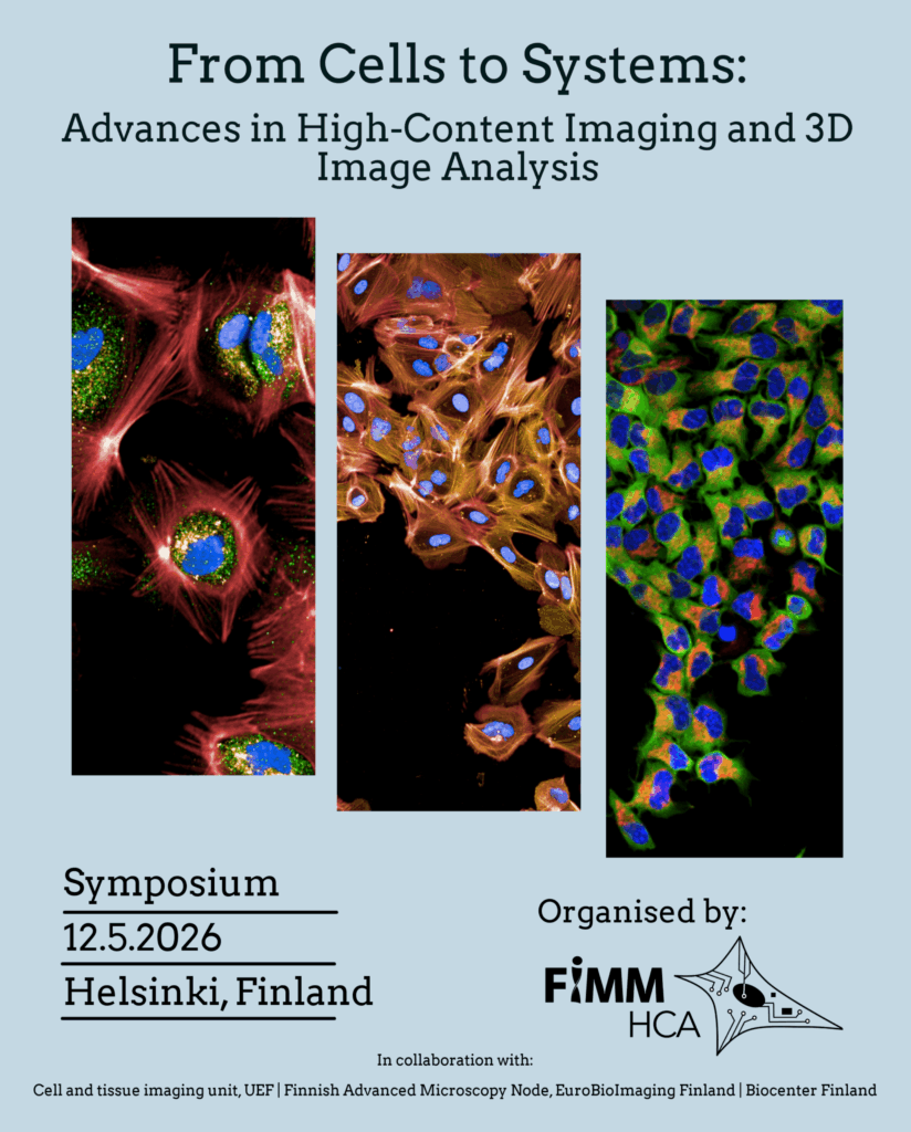 FIMM High Content Imaging and Analysis unit is organizing symposium “From Cells to Systems: Advances in High-Content Imaging and 3D Image Analysis” May 12, 2026 in Helsinki, Finland.